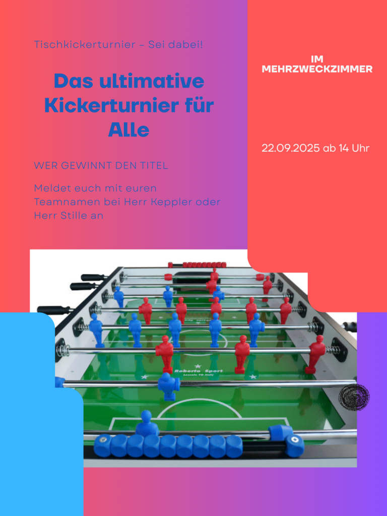 Auf Wunsch der Kinder findet in der nächsten Woche, am Montag, dem 22.09.25 unser erstes Kickerturnier in diesem Schuljahr statt.